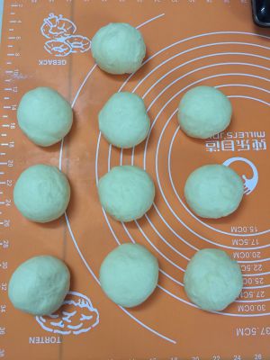 排气后,均分成10份,滚圆,盖上保鲜膜松弛15分钟。