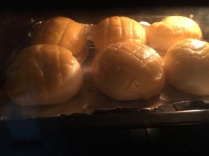 烤箱中放置一碗热水,将全部整形完的面包胚继续发酵40分钟。