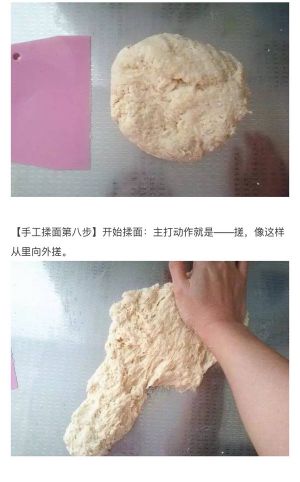 (借用大师的图片)取出面团后,用搓和收拢的动作进行揉面。
