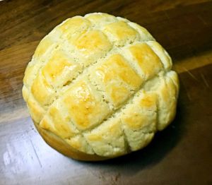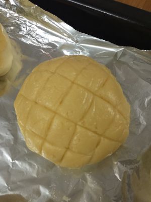 将压扁的菠萝皮盖在面团上,用小刀在菠萝皮上划出菠萝纹。