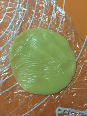 菠萝皮面团揉圆后放在保鲜膜上,上面再盖上保鲜膜,压扁。