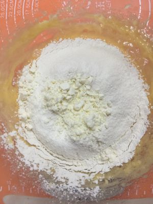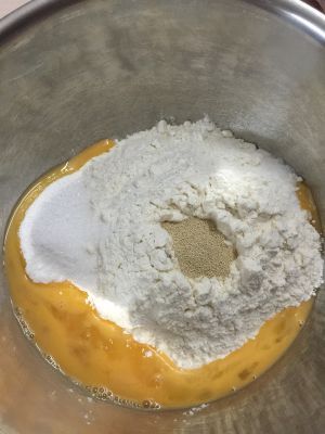 面粉中加入细砂糖、全蛋液、盐和酵母。