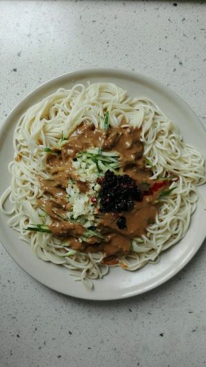把酱淋在面上,喜欢吃辣的朋友可以加一勺辣酱。
