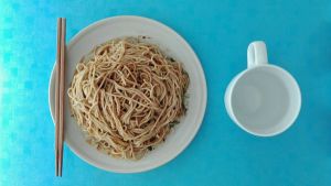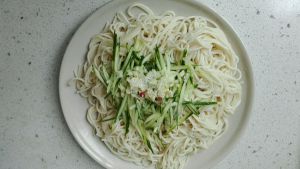 2 黄瓜切丝,蒜和花生切碎,放在面条上,撒入适量盐和鸡精。
