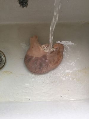看到没,抠出来那些白色的东西,然后把整个猪肚里外冲洗干净
