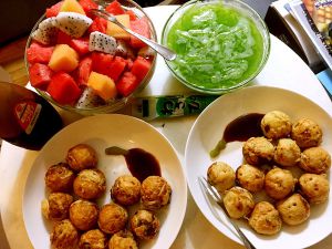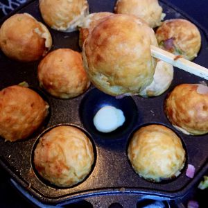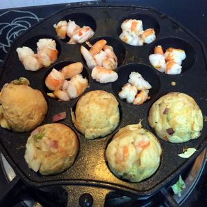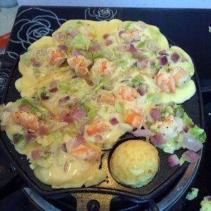 先放一点点菜,放芝士,再放一点点菜,放虾肉。用竹签划开面糊糊,把成型的弄到上面,其他的团一团放到坑里。也有馅料裸露出来的,不散架的话无妨,馅料在坑坑里煎一下味道也很好。