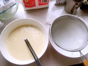 面粉、淀粉、泡打粉、凉水、鸡蛋搅拌成面糊,过筛,这样面糊会柔滑而且细腻。