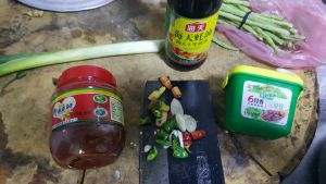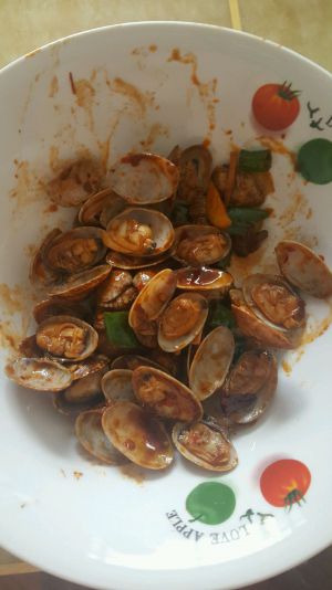 锅中放油,把切好的葱,姜,干辣椒,鲜辣椒,郫县豆酱放入锅中炒香,然后倒入花蛤,少许黄豆酱翻炒,觉得差不多的时候淋入耗油,翻炒几下出锅