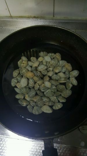 把买来的花蛤洗一下,放入锅中煮一下,等花蛤开口捞出,用清水冲一下防止有泥沙