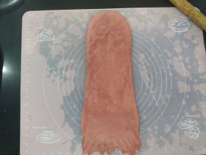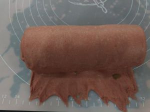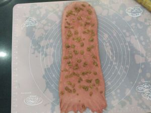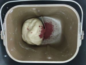 将380克的面团和红曲粉加入面包桶搅拌均匀。
