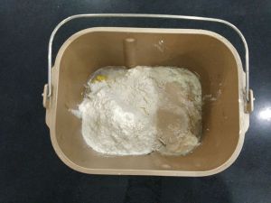 将高筋面粉200克、低筋面粉50克、砂糖40克、盐2克、奶粉10克、黃油20克、鸡蛋1个、水105克、酵母3克放入面包桶,选择和菜单和30分钟。