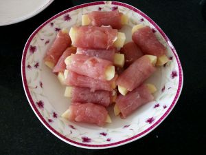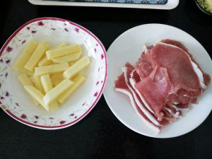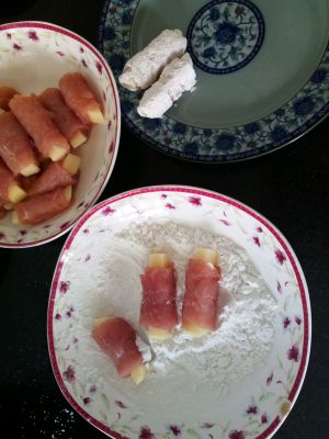将土豆条用肉片卷好备好
