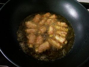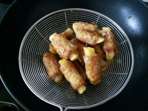 炸制土豆卷熟,微黄捞出控油