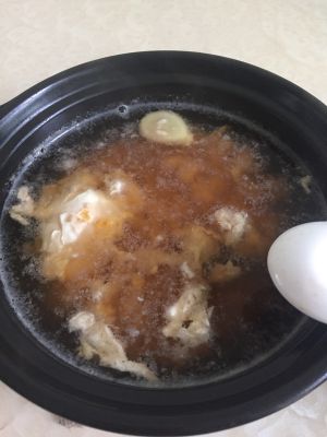 水块开的时候加入甜白酒,不知道你们叫什么。这东西甜着呢,我放了两勺,你们喜欢吃的可以多放一些哦。然后关小火,打鸡蛋进去!不要翻动它~