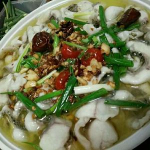 3、油锅烧热,下入姜片,炒鱼头和鱼骨头,放入水 ,煮开了,放酸菜,再煮开,把鱼头鱼骨头酸菜捞出来 ,鱼汤煮开,把腌好的鱼片放下去,大火煮开两分钟后鱼片连汤一起装盆中,酸菜鱼上面放灯笼椒、蒜、香葱或香菜(也可以不放根据自己口味来) 油锅烧热,放花椒 泼在酸菜鱼上面,酸菜鱼一定要泼油才会好吃更香(喜欢吃辣的,记得放点辣椒,不喜欢辣的可以直接泼油)