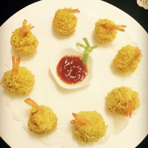 用土豆泥包住虾,在用鸡蛋液过一下,最后再裹上方便面