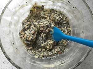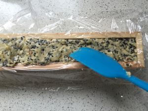 饼干模中铺上保鲜膜,将面团装入模具中压紧实。放入冰箱冷冻一小时左右。