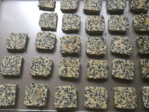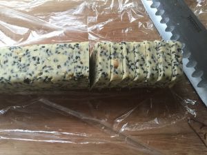取出冻硬的饼干面团,用刀切成厚约4毫米的饼干片