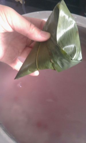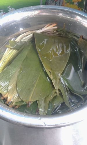 先将粽叶叶和马莲叶洗干净,煮透,这样容易包。