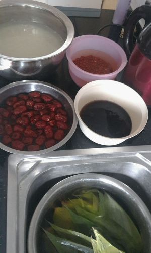 把浸泡好的各种米,豆,枣,准备好。