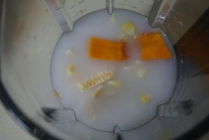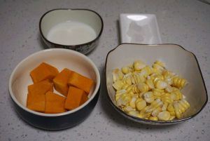 南瓜去皮洗净切块,鲜玉米洗净剥出玉米粒。一定要放一些牛奶,这样做出的粥口感更绵滑。冰糖不用多,3块左右即可。