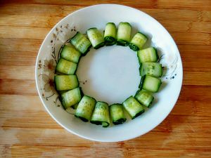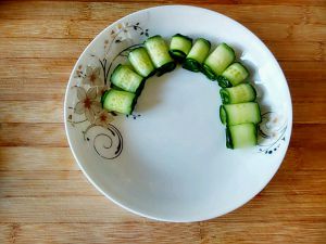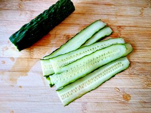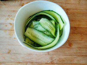 黄瓜洗干净切成两半,用刮皮刀削成一条一条的。