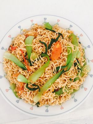 锅中倒油,油热后下鸡蛋,炒散,下西红柿和上海青,超软放少量盐和生抽调味,接下来放入方便面翻炒一会,关火,出锅