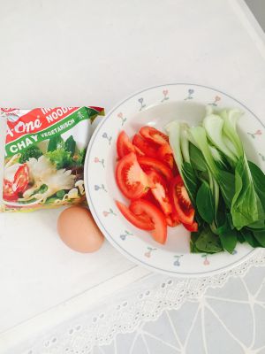 原料,西红柿切块,上海青用刀划成两半,鸡蛋打散
