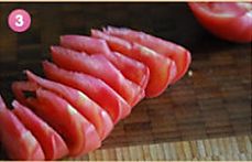 西红柿切成瓣,然后中间来一刀切成块。