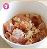 鸡腿剔骨留肉切丁,放入少许盐和味精腌制5分钟。