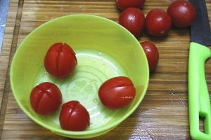准备伴碟配菜:圣女果浸泡清洗,切成十字形。