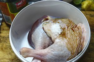 充分解冻的鸭腿清洗干净,用厨房用纸吸干水分。