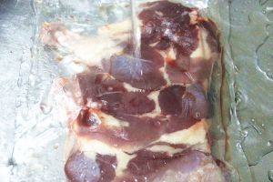 冰冻的鸭腿连包装袋清水浸泡解冻。