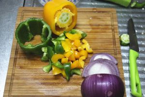 青圆椒、黄圆椒切开首位挖去籽,切粒,洋葱对半切开,切丝。