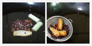 锅中倒油,加入姜片、大葱、花椒、八角小火炸出香味后将香料捞出不要