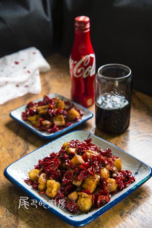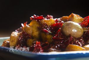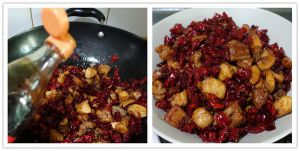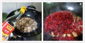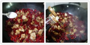 烹入少许料酒,下辣椒段,翻炒出香味。干辣椒段在下锅前先用清水冲洗一下,一是去除泥沙,二是使辣椒段略为湿润,翻炒时不容易炒焦