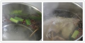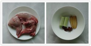 清水中加一半的姜片、大葱、花椒、八角、料酒,煮沸后放入整只兔肉汆水
