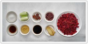 最显眼的是红彤彤的干辣椒,干辣椒要剪成小段,辣椒籽尽量去除不要