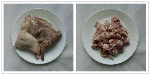 汆水后的兔肉去骨、切成1.5cm见方的丁