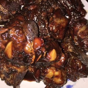 2、将煮好的排骨过一遍水,放到容器里进行腌制(料酒、酱油和醋)二十分钟左右。