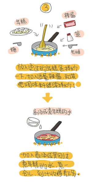 放入烫过的年糕条拌炒一下,加入适量辣酱,和其他调味料继续炒!加入高汤或是刚才煮年糕的水,煮一会,到汁收的差不多。