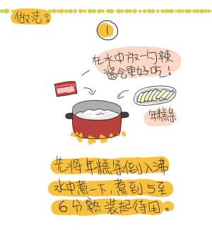 先将年糕条倒入沸水中煮一下,煮到5至6分熟装起待用。