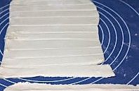 将醒发好的面团两面撒少许面粉后擀成方形的薄片,用刀横向划条纹后,用手拿起其中一条,揪成约5cm长的面片
