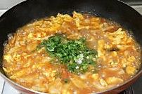 将番茄汤调制中火,加入蛋碎后保持微微沸腾的状态,将揪好的面片放进汤里,用筷子轻轻搅拌一下。全部面片揪进去以后开大火约30秒熄火,淋入香醋,加入香葱碎即可