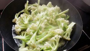 锅内少油,加姜,蒜,花椒,干辣椒,煸香,倒入花菜翻炒