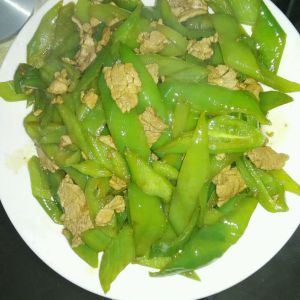 青椒下油爆炒,炒至7层熟,放点盐,翻炒均匀,起锅备用