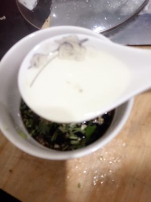 再舀一勺煮鸡的汤。最后 再调料里淋上热油。