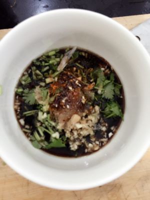 蒜头捣成泥 ,香菜 葱分别切碎。加入 生抽 醋 麻油。红油。花椒粉。孜然粉。糖盐