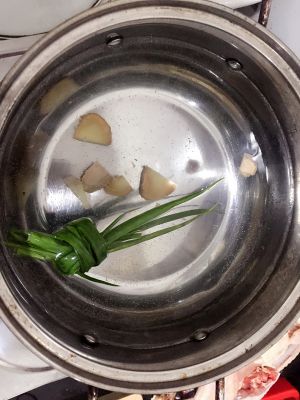 锅里水放多些可以淹没鸡,放葱姜 ,将水烧开。