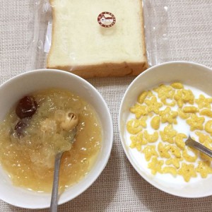 配上儿童麦片加牛奶。这是我们母子二人的早餐。